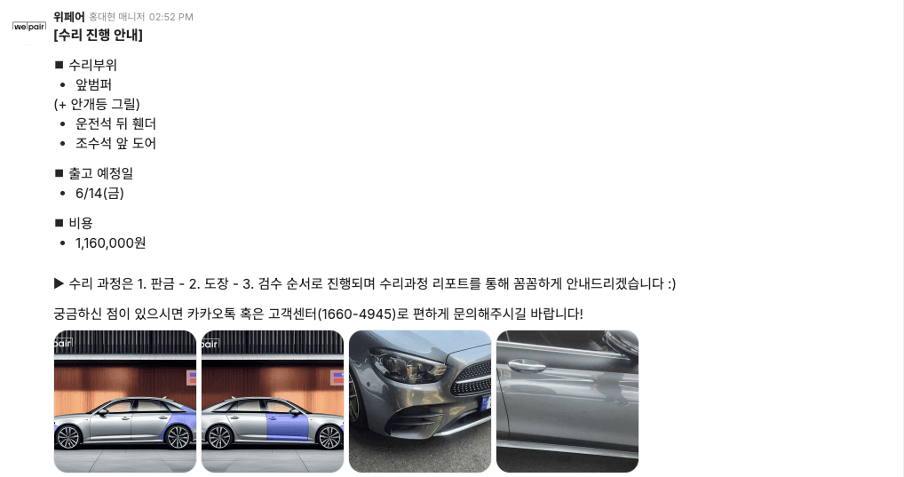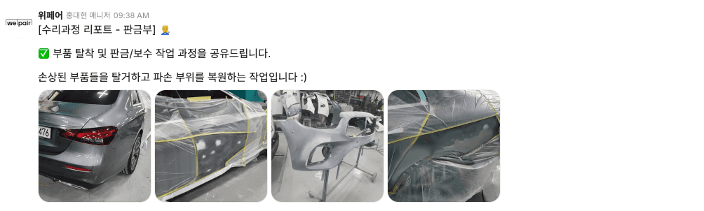 자동차 수리가 진행될 때마다 실시간으로 리포팅을 발송드려