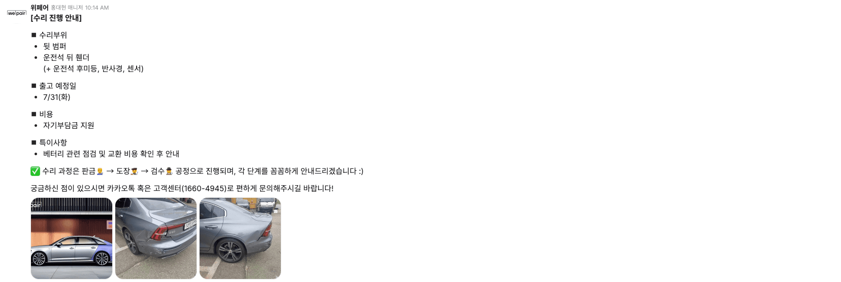 S60의 수리 과정을 실시간으로 차주님에게 안내드리고 있습니다.