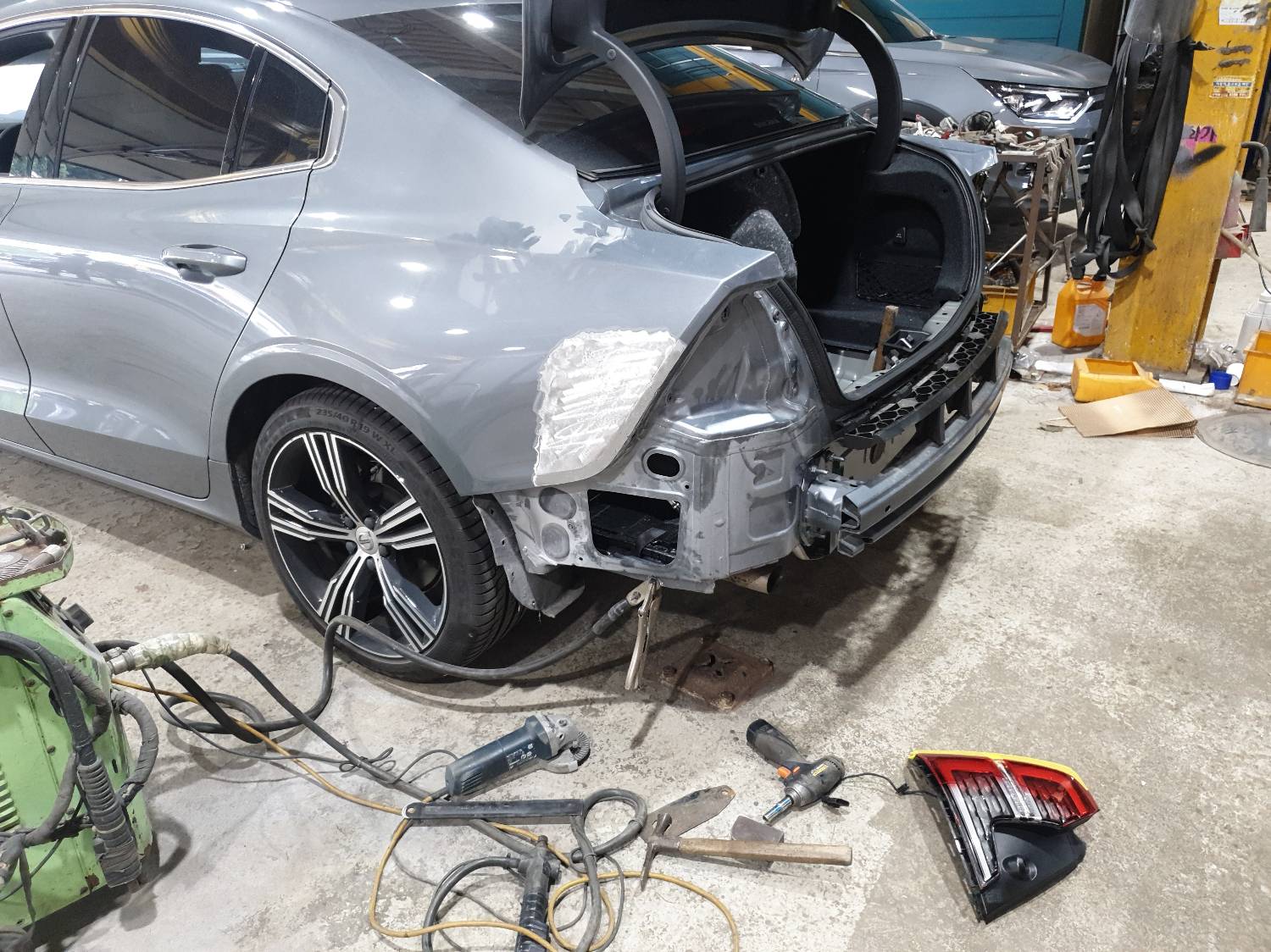 가장 먼저 볼보 수리를 진행할 뒷범퍼는 탈거를 진행합니다.