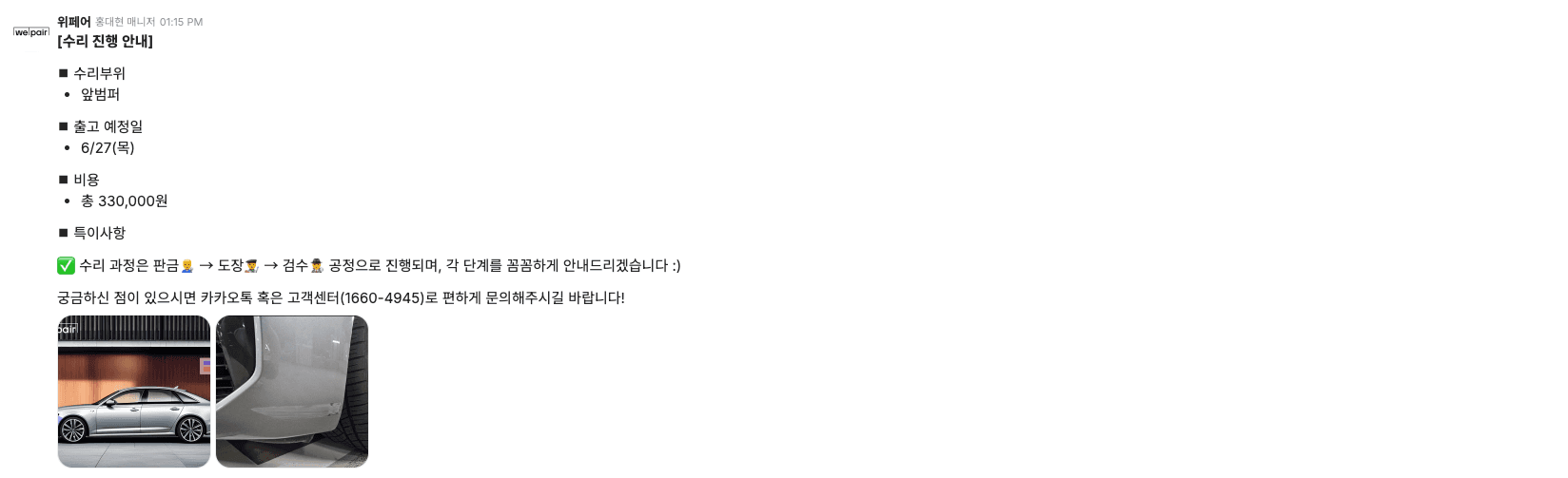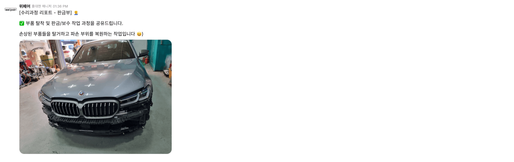 바로 차량이 입고된 후 차주님에게 수리 부위와