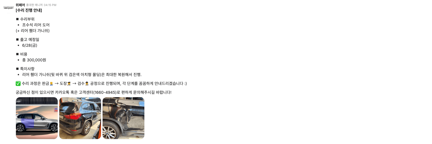 그리고 수리비를 확인하실 수 있도록 메세지를 전달드리게 됩니다.