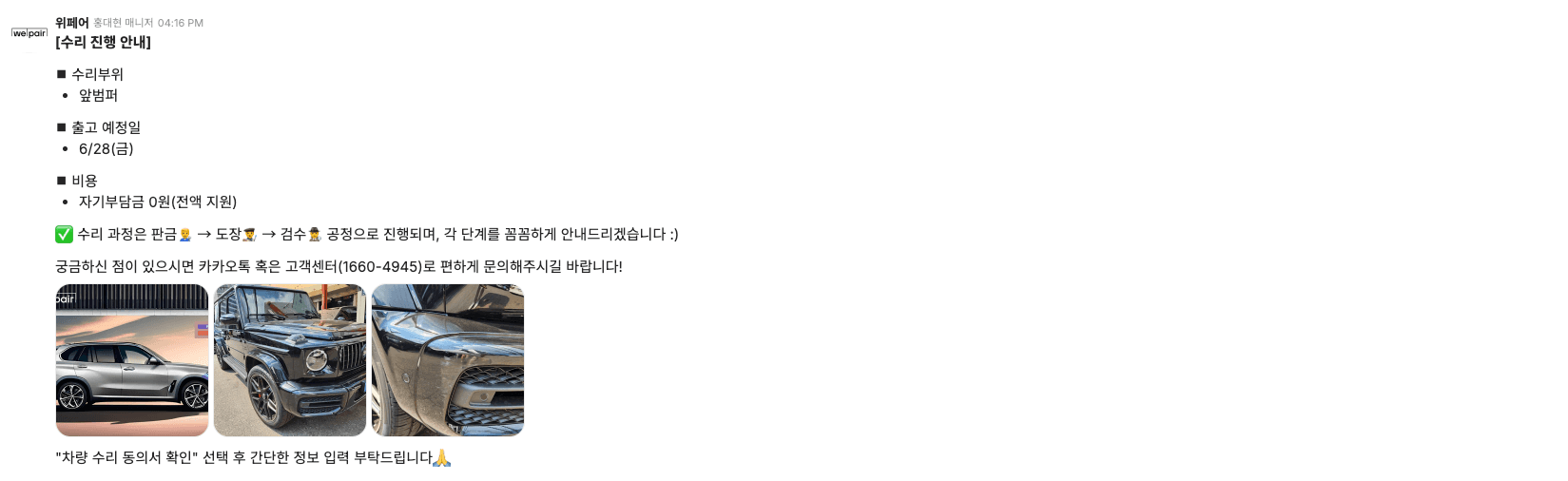 현재 위페어 리스토어팀에서 벤츠 수리를 보험처리로 진행하실 경우