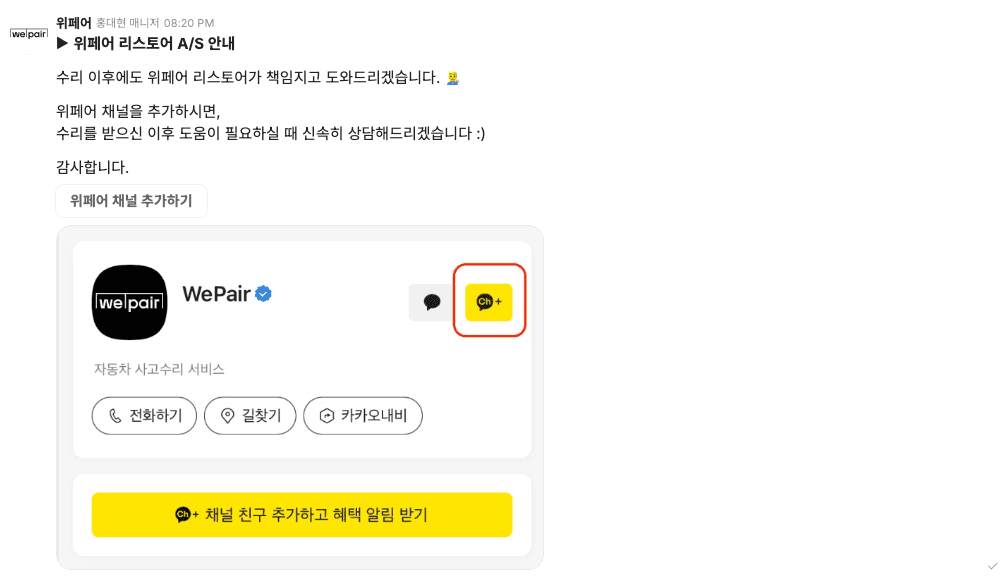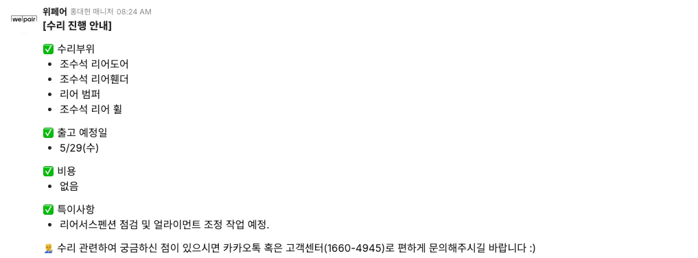 이를 통해 수리를 맡긴 차주님께서는